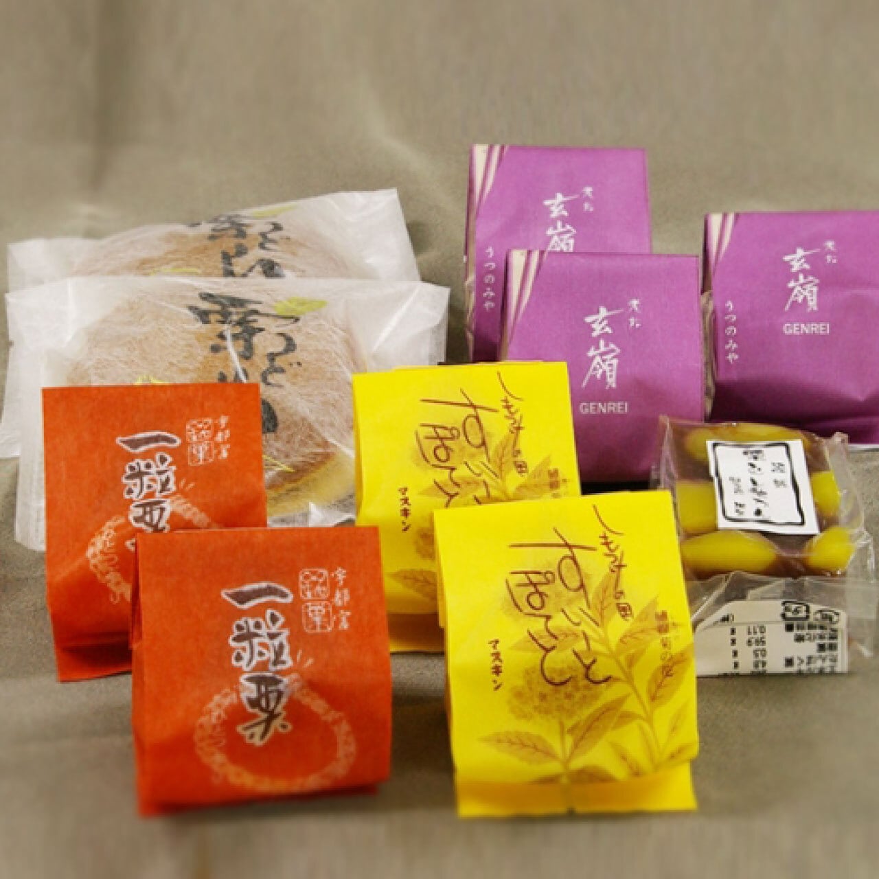【内容量】栗どら焼き×2個、すぃーとぽてと×2個、名菓 一粒栗×2個、玄嶺 蒸し菓子×3個、栗蒸し羊羹×小1本