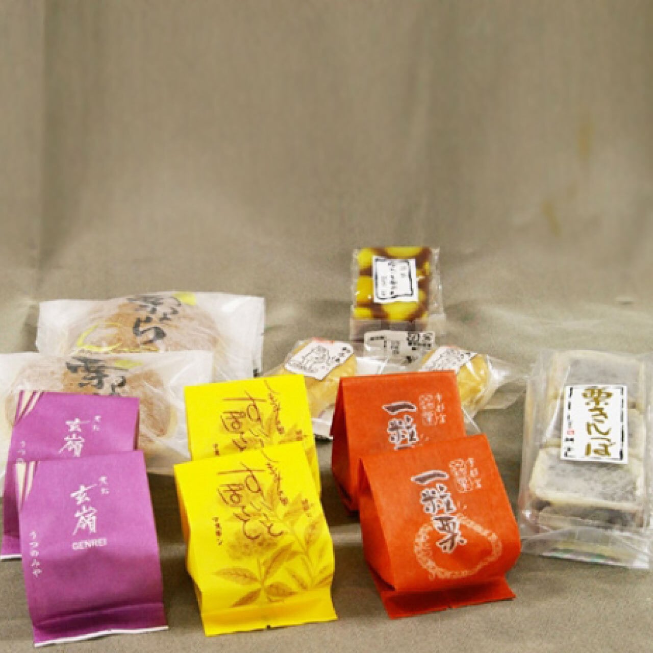 【内容量】栗どら焼き×2個、すぃーとぽてと×2個、名菓 一粒栗×2個、玄嶺 蒸し菓子×3個、栗蒸し羊羹×小1本、栗きんつば×1袋、餃子像もなか×2個